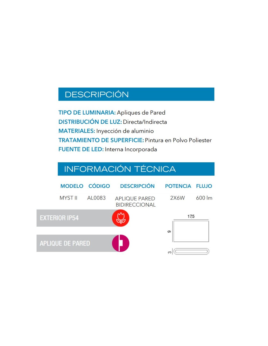 APLIQUE BIDIRECCIONAL MYST II LED 2X6W BLANCO 3000K ALIMINIO
