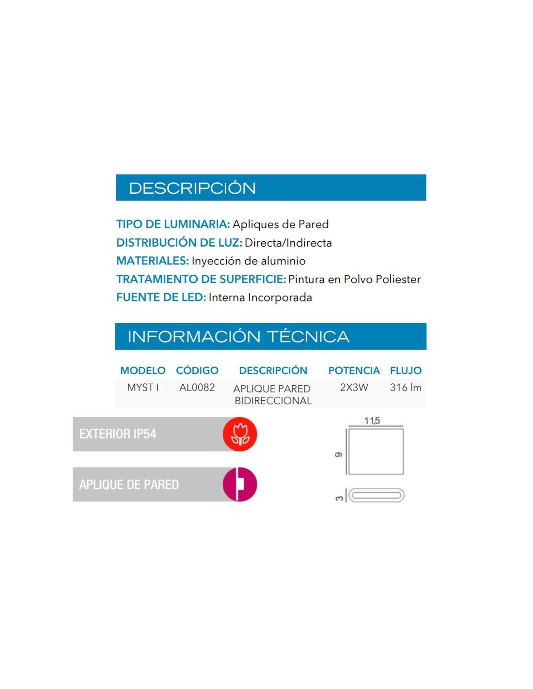 APLIQUE BIDIRECCIONAL MYST I LED 2X3W BLANCO 3000K ALUMINIO