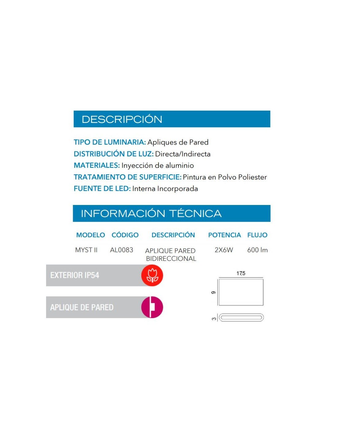 APLIQUE BIDIRECCIONAL MYST II LED 2X6W NEGRO 3000K ALUMINIO